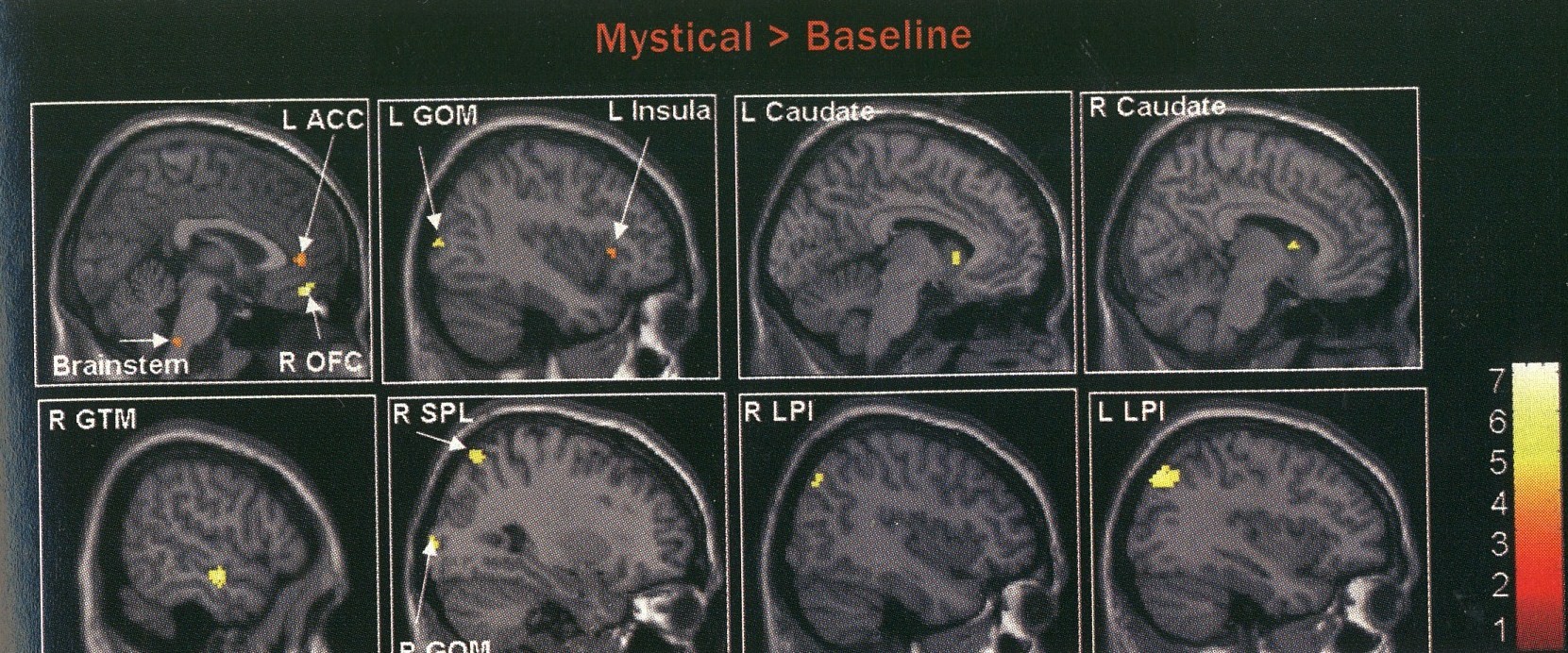 In a 2006 study the recall by nuns of communion with God invigorated the brain’s caudate nucleus, insula, inferior parietal lobe (IPL) and medial orbitofrontal cortex (MOFC), among other brain regions. Image: Neural Correlates of a Mystical Experience in Nuns, by M. Beauregard and V. Paquette, in Neuroscience Letters, Vol. 405, No. 3; 2006