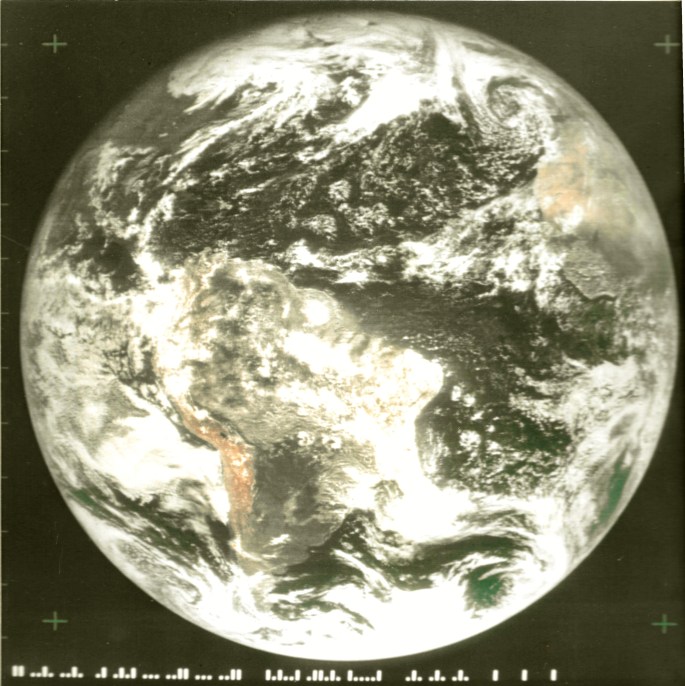 I received a print of this photograph from the original negative, described as the “first color photo ever made of the entire earth,” as a result of my father’s employment at the Missile and Space Division of the General Electric Company, engaged in the effort to put an American astronaut on the moon. The souvenir photo was presented to me at age 15 as a gift intended to inspire and encourage my interest in all things related to space travel and to astronomy. I have lovingly preserved the image these many years, and although it is beginning to show its age, it still holds a particular fascination for me, and continues to inspire and encourage my interest in the perspective only possible to achieve from stepping away from the earth-bound view of life.