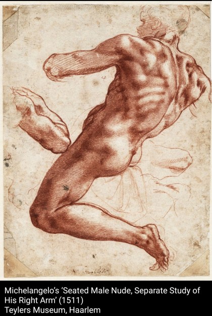 An exhibition currently taking place at the Cleveland Museum of Art, “Michelangelo: Mind of the Master,” according to a review by Eric Gibson in the November 18, Life and Arts section of the WSJ, “features 51 drawings by Michelangelo…Tracing the arc of his career…from anatomical illustrations, to figure studies…to architectural renderings.” Gibson makes particular note of how the “outlines reflect greater effort. They are darker, having been repeatedly gone over…as if Michelangelo regarded these contours as a kind of keynote, the essential element to be got right if everything else was to follow as it should,” remarking notably that the “intense energy and vigorous handling gives them an almost overwhelming power.”