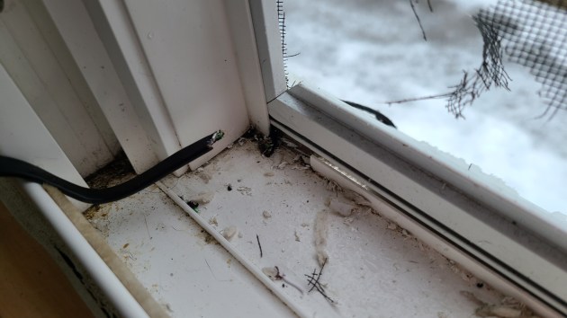 Sure enough, not only had the animal penetrated the screens, but for some reason it decided to make a meal out of the wire which ran over the window sill.
